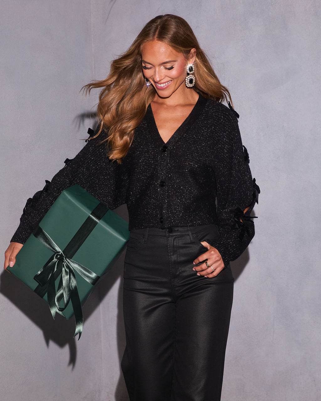 Capture the sparkle of a winter night with a cardigan that's pure party perfection. The Cold Flame Metallic Knit Open Sleeve Cardigan is designed to make you the center of attention. This midweight ribbed knit piece shimmers with metallic threading, while slit sleeves with velvet bow tie accents add a dose of unexpected charm. It's the statement piece your holiday wardrobe needs for an instant touch of glam and festive fun.