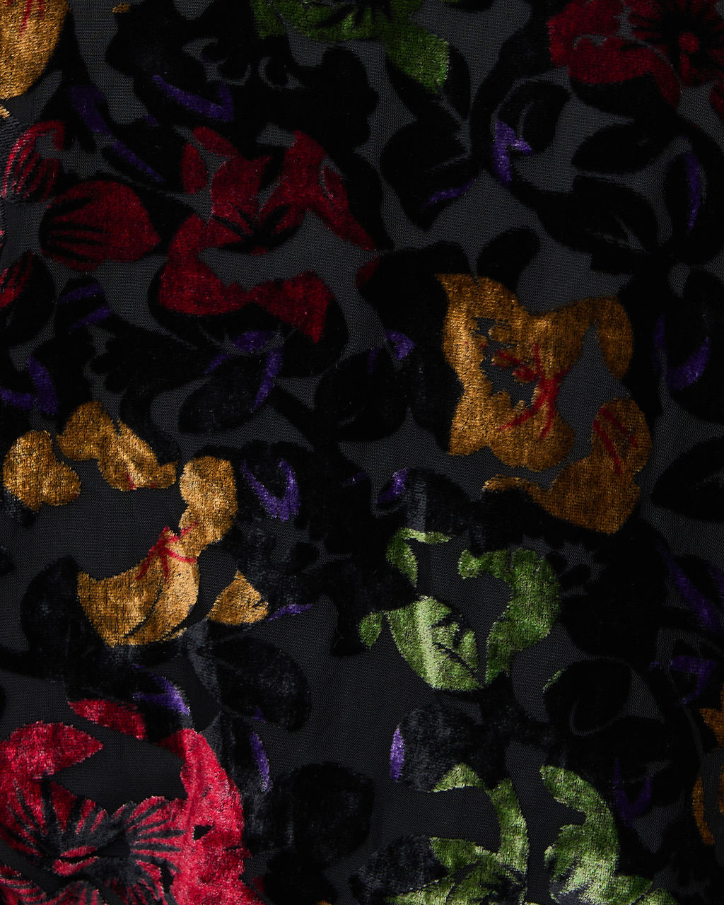 - Mesh fabric overlay with velvet floral design throughout