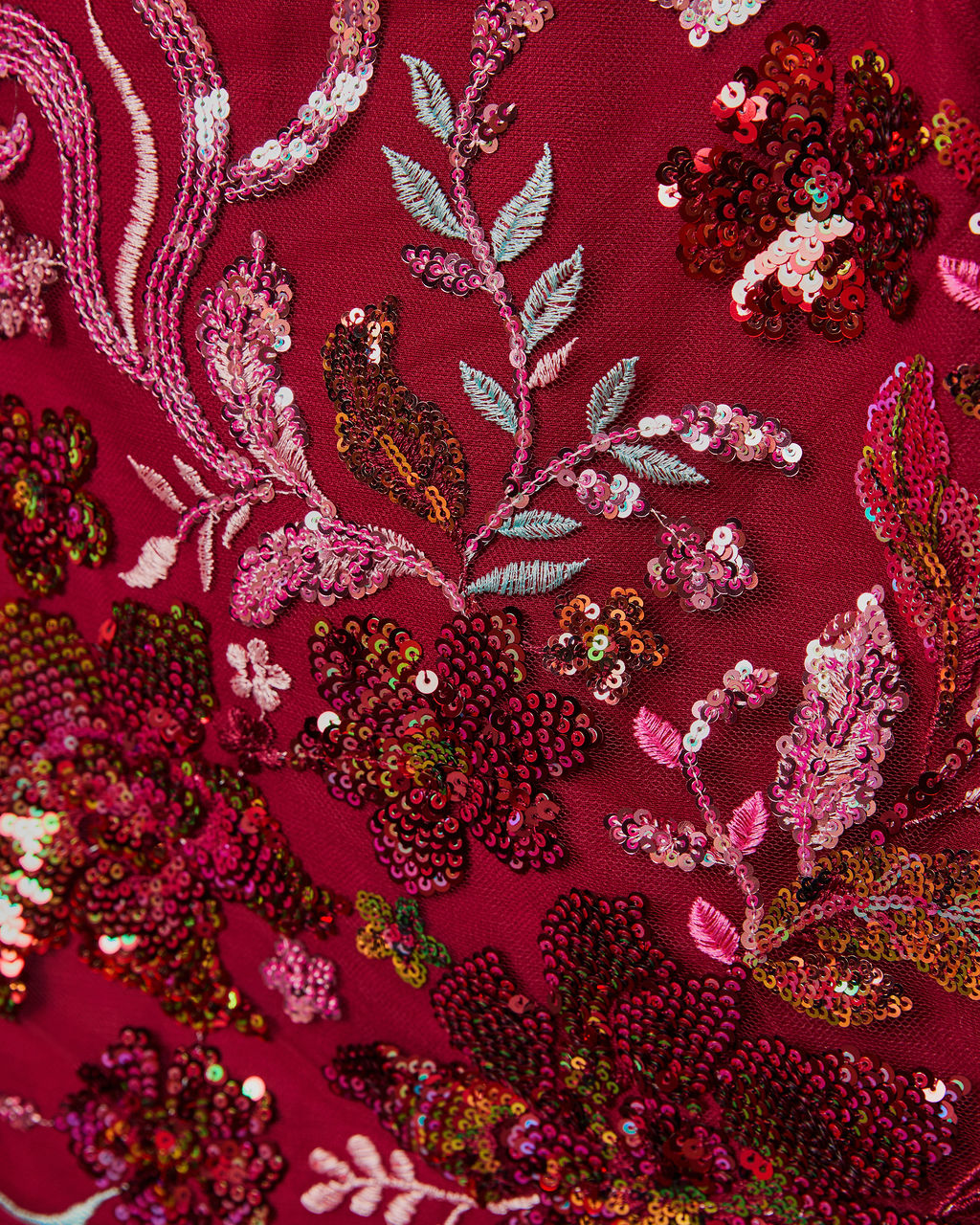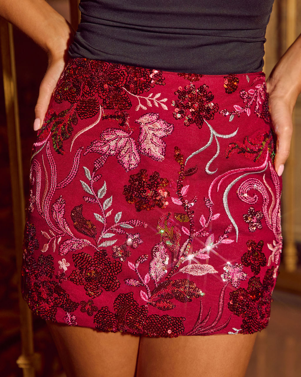Consider this your secret garden of glamour, ready to bloom after dark. The Garden Drop Sequin Embellished Mini Skirt is where enchanting design meets party-ready style. This stunning piece features a delicate mesh fabric brought to life with a botanical-inspired design, meticulously detailed with shimmering sequin embellishments. The rigid, non-stretch material ensures the skirt holds its flattering shape, while a hidden side zipper closure provides a seamless finish.